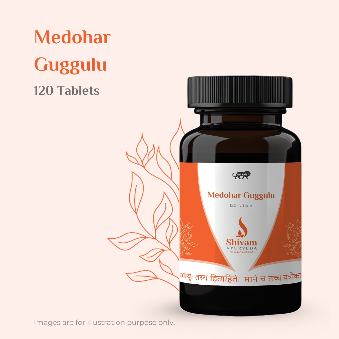 Shivam Ayurveda Medohar Guggulu is a classical Ayurvedic formulation referenced in authoritative Ayurvedic texts and prepared using traditional herbs such as Triphala (Haritaki, Bibhitaki, Amalaki), Trikatu (Pippali, Sunthi, Maricha), Guggulu, and other botanicals including Chitrak, Vidanga, and Nagarmotha. Traditionally used in Ayurveda to support digestive fire (Agni), this formulation helps balance Pitta and Kapha doshas and assists the body’s natural metabolic processes. Each uncoated tablet is manufactured in a GMP-certified facility to ensure purity, safety, and potency. Free from synthetic preservatives or additives, Medohar Guggulu is suitable for individuals seeking traditional Ayurvedic support for digestion, metabolism, and internal balance under the guidance of an Ayurvedic practitioner.