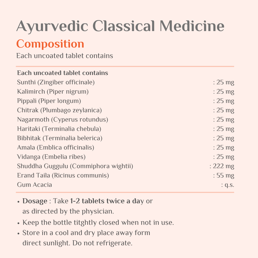 • Ayurvedic Blend: Medohar Guggulu is prepared as per classical Ayurvedic texts using Guggulu, Triphala, and Trikatu to support internal cleansing and metabolic wellness.