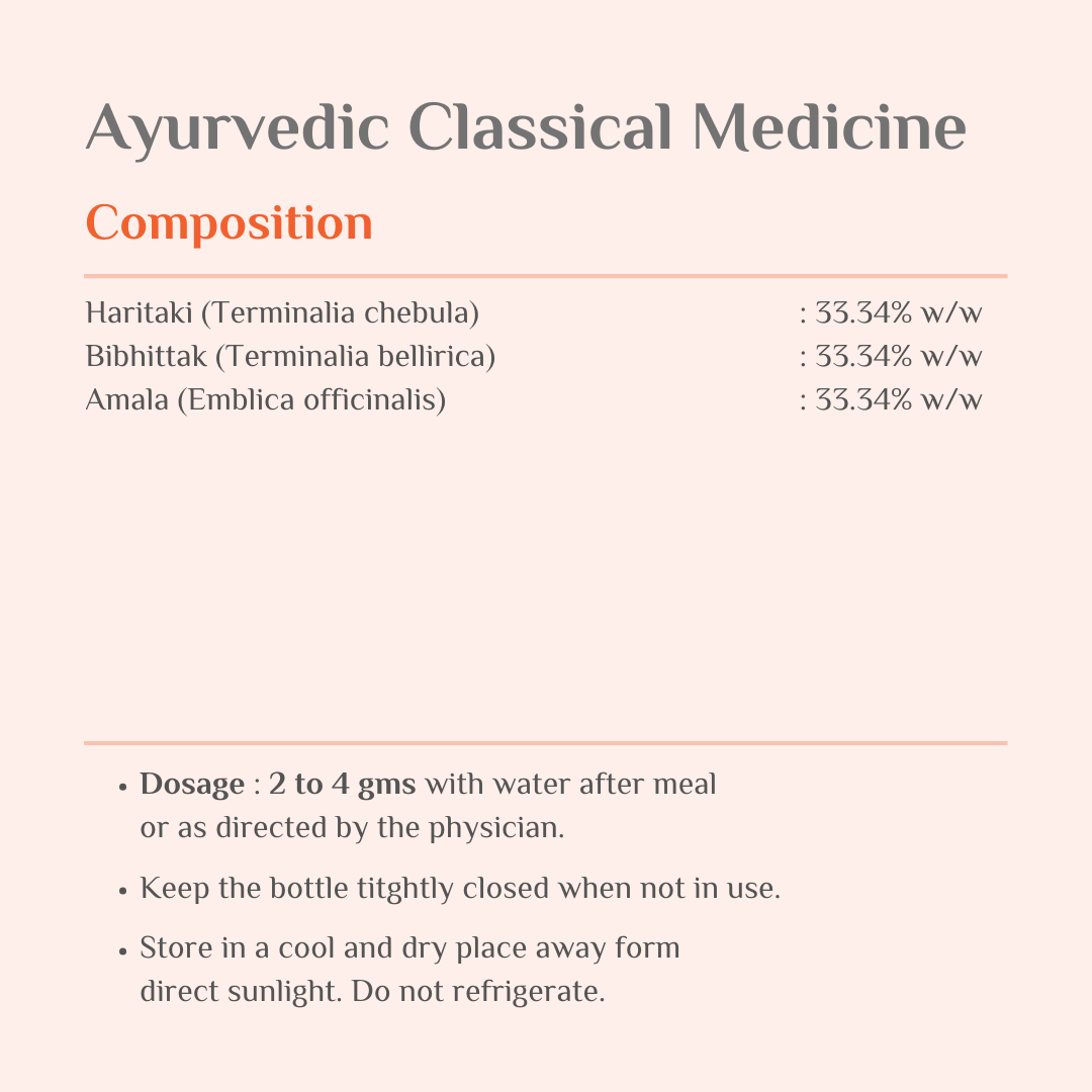 - Pure & Natural Triphala Powder: Made from high-quality Haritaki, Bibhitaki, and Amla fruits, carefully sourced and finely powdered for maximum potency.